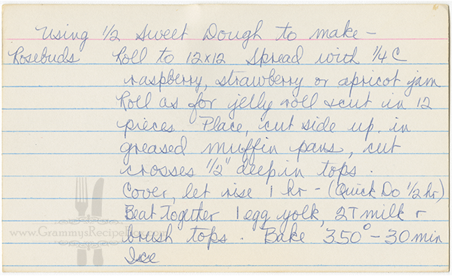 This recipe is written in ballpoint pen in my Grammy's handwriting. The recipe uses half of the basic sweet dough recipe found here. Once the dough has been prepared, the following instructions are followed to produce baked rosebuds.